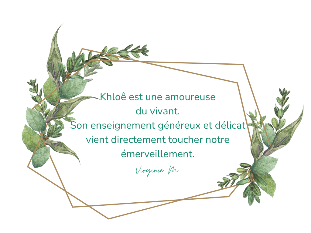 Khloê est une amoureuse du vivant. Son enseignement généreux et délicat vient directement toucher notre émerveillement. Elle extrait la substance d’une connaissance profonde, multiple, précise, poétique, sensuelle et incarnée pour nous la rendre accessible. Elle nous ouvre des portes précieuses vers le monde des plantes qui nous entourent et nous permet de porter un nouveau regard et de les faire rentrer dans notre quotidien autrement. Virginie M.