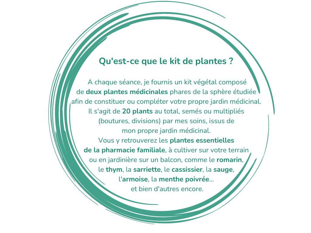 - Kit de 20 plantes médicinales : 2 plants fournis à chaque séance, pour vous familiariser avec ces nouvelles alliées de votre santé et constituer votre propre jardin médicinal.